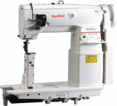 Высокоскоростная колонковая двухигольная машина челночного стежка с игольным транспортом.