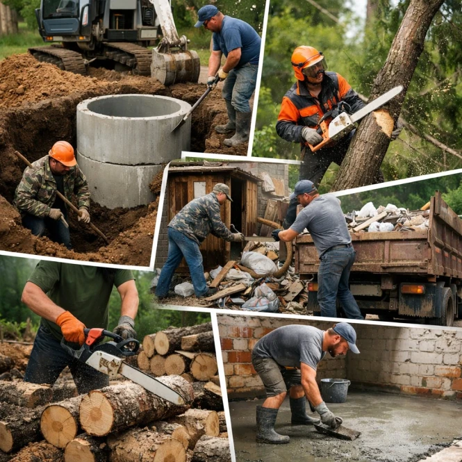 Жұмысшы қазу, септика, ағаштарды кесу, аумақты жинау, қоқыстарды шығару
